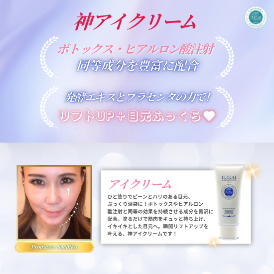 "この神アイクリームのひと塗りでピーンとした目元・ぷっくり涙袋に!"このアイクリームにはボトックスとヒアルロン酸注射と同等の効果を持続させる成分を豊富に配合されており、塗るボトックスとヒアルロン注射の神アイクリームで顔の筋肉がキュッと上に、イキイキとした目元になります!瞬間的に効果が出て、リフトアップしてくれるアイクリームが欲しかったので作っちゃいました!