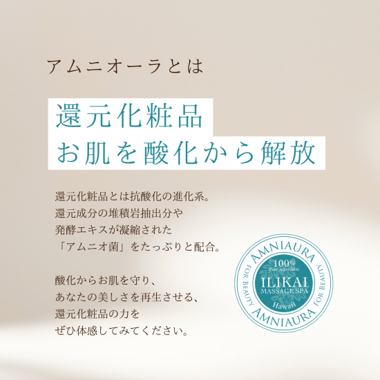 アムニオーラは、llikai Massage Spa Hawaii が美容研究科、電位技術研究所チームを集結し、約10年を費やし完成したスキンケアシリーズです。